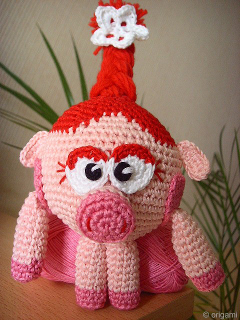 До Нюши вязала Кроша по Вашей методе - неплохо вышло, несмотря на то, что я вообще не вяжу, хотя вроде и умею немного. :) А так как не вяжу, Кроша вязала почему-то за одну нитку, получился немного рыхловат. Потом уже подруга объяснила, что нужно за обе вязать. Так получается поплотнее.