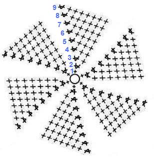 Прибавка (на схеме обозначена галочкой) означает провязать 2 столбика б/н (на схеме обозначен крестиком ) в одну петлю.