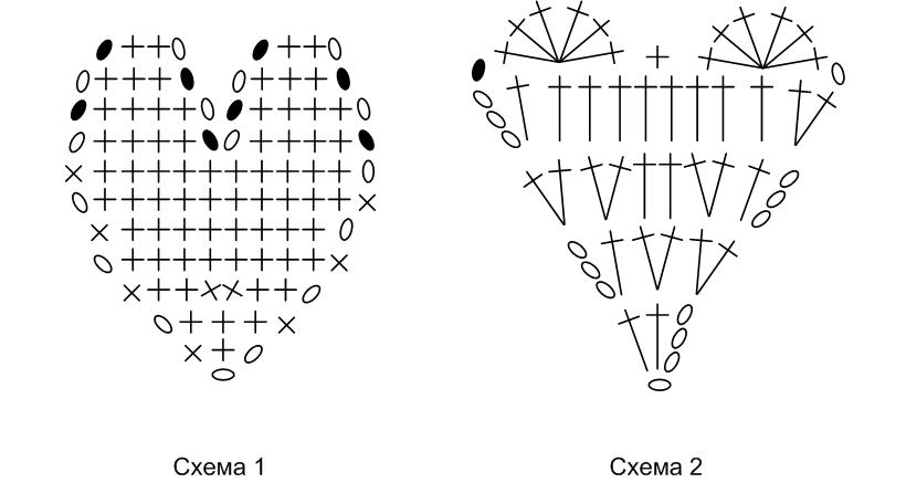 Обратите внимание, что полукруги сердечка по схеме 1 вяжутся с отрывом нити: сначала необходимо закончить один полукруг и оборвать нить, а затем вязать следующий.