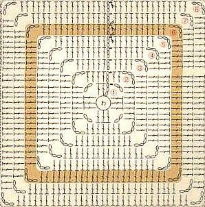 Вяжутся лепестки по-отдельности (сначала один, потом второй и третий), но без отрыва нити. Т.е. когда лепесток провязан полностью, то необходимо вернуться обратно в центр (точка Н), провязав по краю лепестка 3 соединительных столбика. Этот переход и показан на схеме стрелками. Когда вернулись в начало, то переходим к вязанию второго лепестка и вяжем далее аналогично.