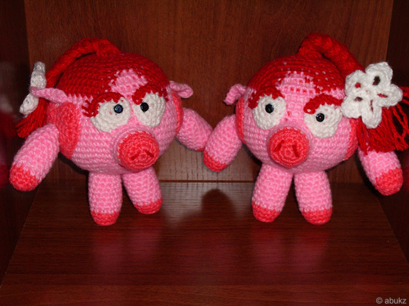 До Нюши вязала Кроша по Вашей методе - неплохо вышло, несмотря на то, что я вообще не вяжу, хотя вроде и умею немного. :) А так как не вяжу, Кроша вязала почему-то за одну нитку, получился немного рыхловат. Потом уже подруга объяснила, что нужно за обе вязать. Так получается поплотнее.